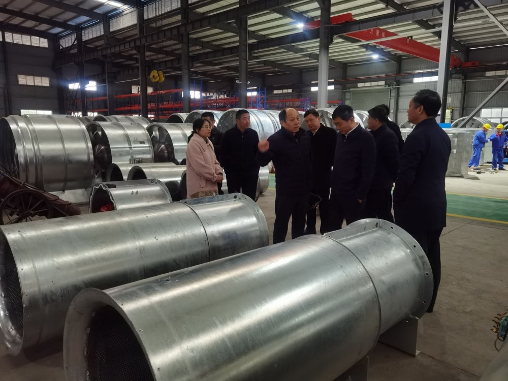 公司總裁劉書(shū)鵬(左二)向省經(jīng)信廳副廳長(zhǎng)郭濤(左三)介紹地鐵風(fēng)機(jī)